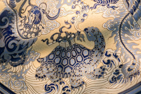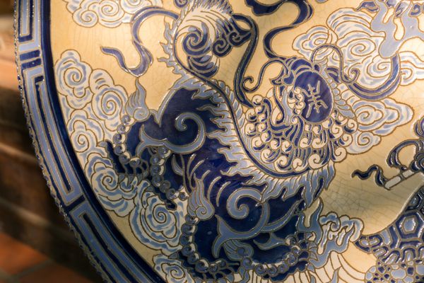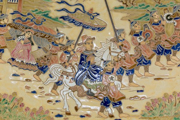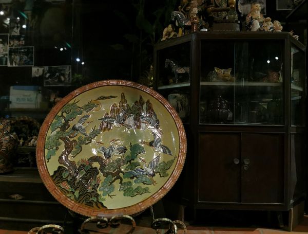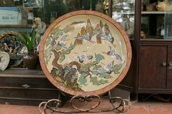 Những bức tranh sáng tác trên đĩa gốm đường kính gần một mét, được khắc thủ công các đề tài quen thuộc như Tùng hạc Diên niên, ngày Vinh quy (Quan Trạng về làng, Long Lân Quy Phụng.