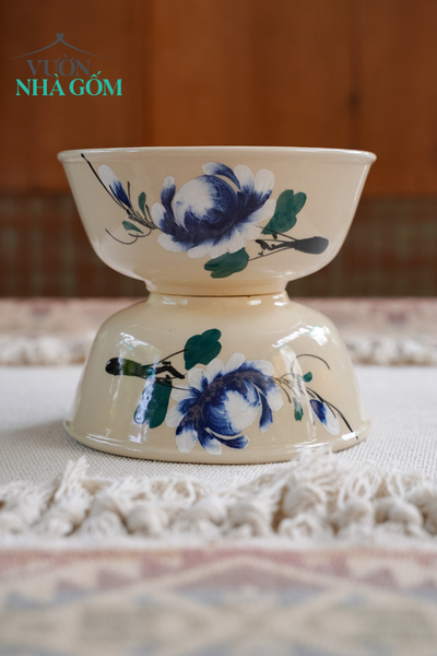 + Chén bát Bông Xanh được trao chuốt mượt mà, chất gốm dày dặn. Hoạ tiết truyền thống vừa tạo điểm nhấn mộc mạc, vừa nổi bật vẻ đẹp của thức ăn được bày biện.