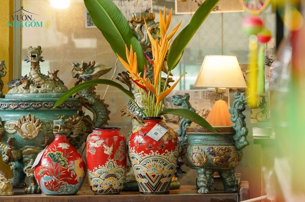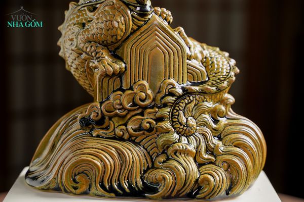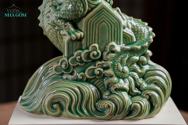 Với năm 2024, họa tiết Thủy Ba không dừng lại ở nét khắc, đường men rực rỡ trên chiếc bình gốm, mà còn được điêu khắc tạo khối trên tặng phẩm Tượng Rồng Thủ Biên.