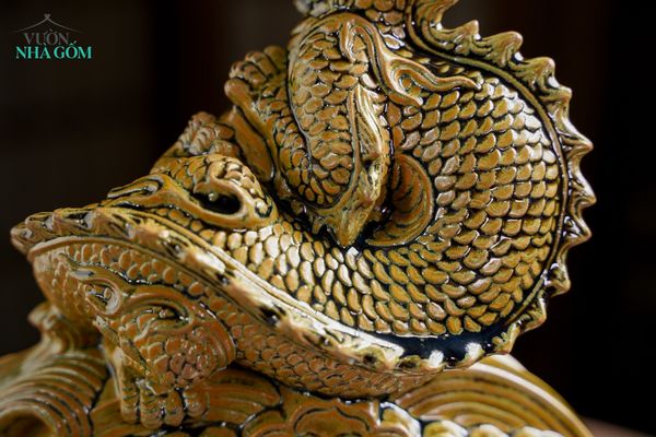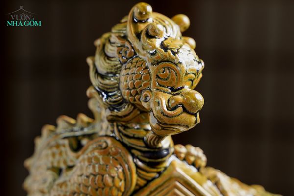 Thêm vào đó, điểm nổi bật và mang lại sức hút nhất cho tượng chính là những phần đọng men ngẫu nhiên trên các họa tiết được chạm khắc tỉ mỉ, tạo nên độ nổi khối chân thực, khiến tác phẩm linh vật Rồng càng thêm linh hồn và sức sống.