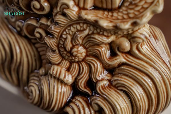 Dự định ban đầu là làm đơn giản đi, vảy rồng trơn nhẵn, bệ đỡ chỉ là một khối đá gập ghềnh. Nhưng nghệ nhân điêu khắc chọn đi đến cùng, vảy rồng được xếp ly chỉnh chu, đẹp mắt, bệ đỡ là chân sóng Thủy Ba trong hoa văn cổ phục Việt...