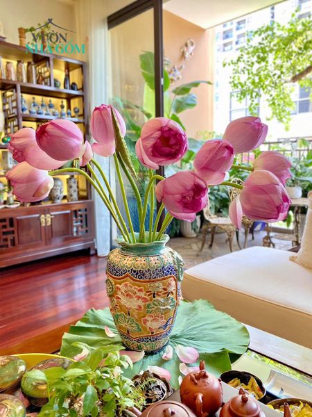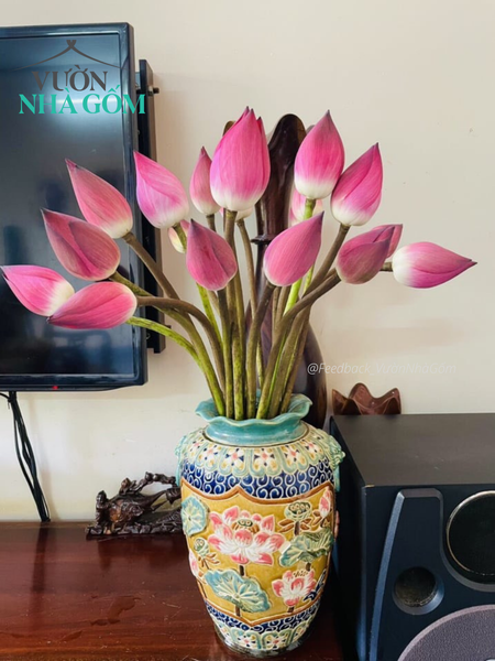 Phía dưới là hình ảnh bình sen được sử dụng tại nhà chị khách ở Hà Nội, một vị khách có gu với những góc nhà được thiết kế rất đẹp mắt. Và vì yêu thích hoa sen nên bình sen đắp nổi cũng được chị ưu ái sử dụng vào mỗi mùa sen đến và mẫu bình này vẫn luôn hoàn thành tốt nhiệm vụ làm điểm tựa cho những đóa sen tuyệt đẹp nở rộ.