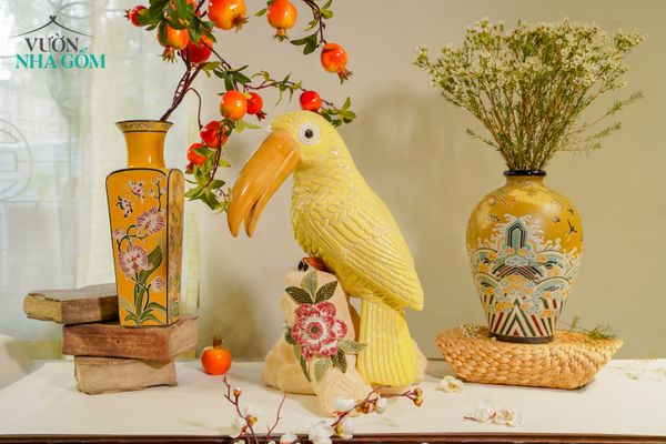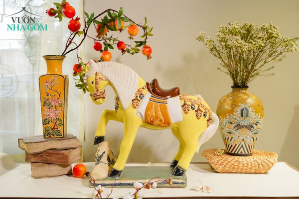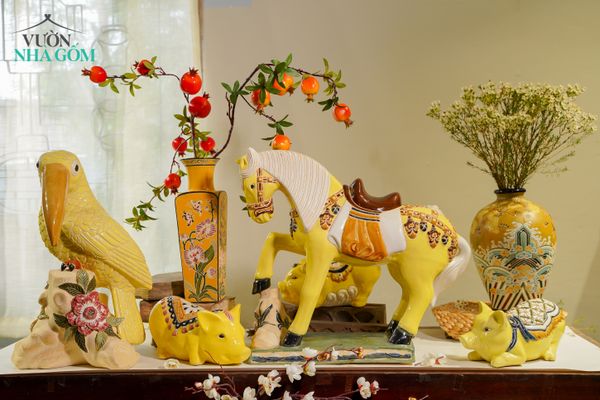 Với gốm Nam Bộ, màu vàng mang chút dịu dàng e ấp, nhẹ nhàng thanh tao nhưng cũng rất nổi bật. Đặc biệt hơn là màu sắc được gửi gắm lên những linh vật được sản xuất tỉ mỉ, tinh tế mang giá trị niềm tin cao đẹp về sự bình an, phú quý.