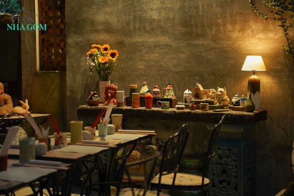 Dưới ánh đèn vàng về đêm, góc workshop ngoài trời của Vườn được sắp đặt để tạo một không gian trầm ấm, mang đến sự thoải mái cho khách hàng đến trải nghiệm nặn gốm tự do.