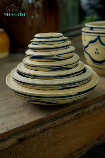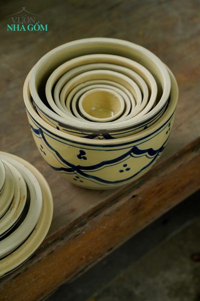 Thố gốm Lái Thiêu vẽ tay hoa văn xanh, đủ mọi kích thước và số lượng, được các quán ăn, nhà hàng toàn quốc ưa chuộng cho một không gian ẩm thực mang màu sắc Nam Bộ.