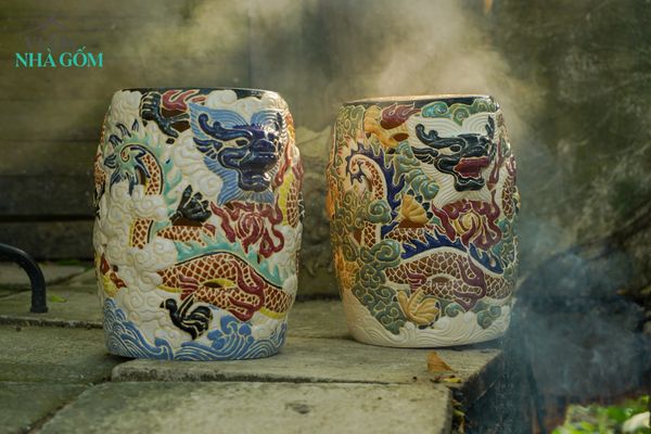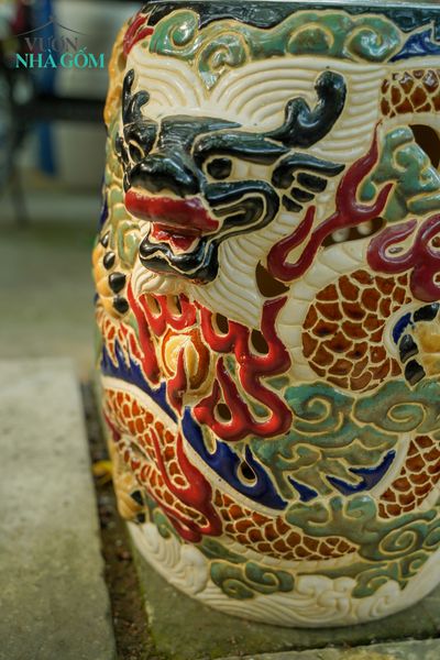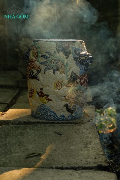 Rồi anh kể thêm về họa tiết, về công sức của người thợ khi phải chấm từng màu men lên từng điểm nhỏ của đôn, cả sự tỉ mỉ khi lọng lỗ trang trí và những rủi ro khi nung lò.