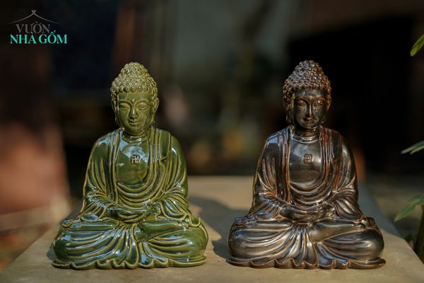 Tượng Phật A Di Đà triện Thủ Biên, men màu Độc Bản - Duy nhất, sau một lần, trong một sát - na nào đó thử men màu ngẫu hứng đã không còn tạo lại được. Đó là vẻ đẹp của men màu, của lửa lò, của gốm thủ công truyền thống.